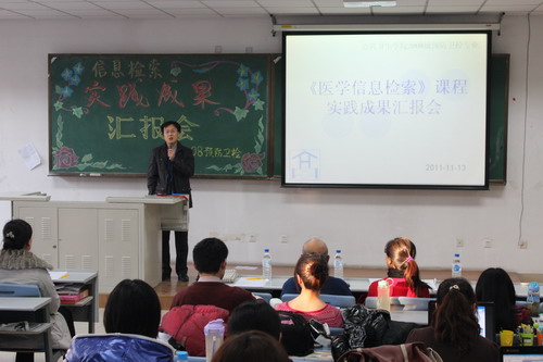 在课程结束之前,于2011年12月13日组织了一场学生的成果展示,由主讲教师沈涌博士主持。除了信息检索教研室老师之外,特邀食品营养教研室的刘华峰博士、流行病与统计学教研室的寇长贵博士——两位预防医学专业的优秀青年教师,从医学专业知识的理解与运用的角度点评指导。主管教学的刘晓冬副院长首先阐述了这次教学改革的意义,并代表黑料不打烊
