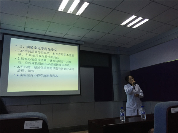放射实验教学中心主任张海英老师、预防实验教学中心主任赵淑华老师、生物安全实验室负责人甄清老师、医学信息实验教学中心邹男男老师分别就辐射安全、化学安全、生物安全、网络信息安全四个方面进行专项培训,此次培训覆盖面广、针对性强,课后利用考试巩固培训效果,使学生时刻紧绷实验室安全这根弦。