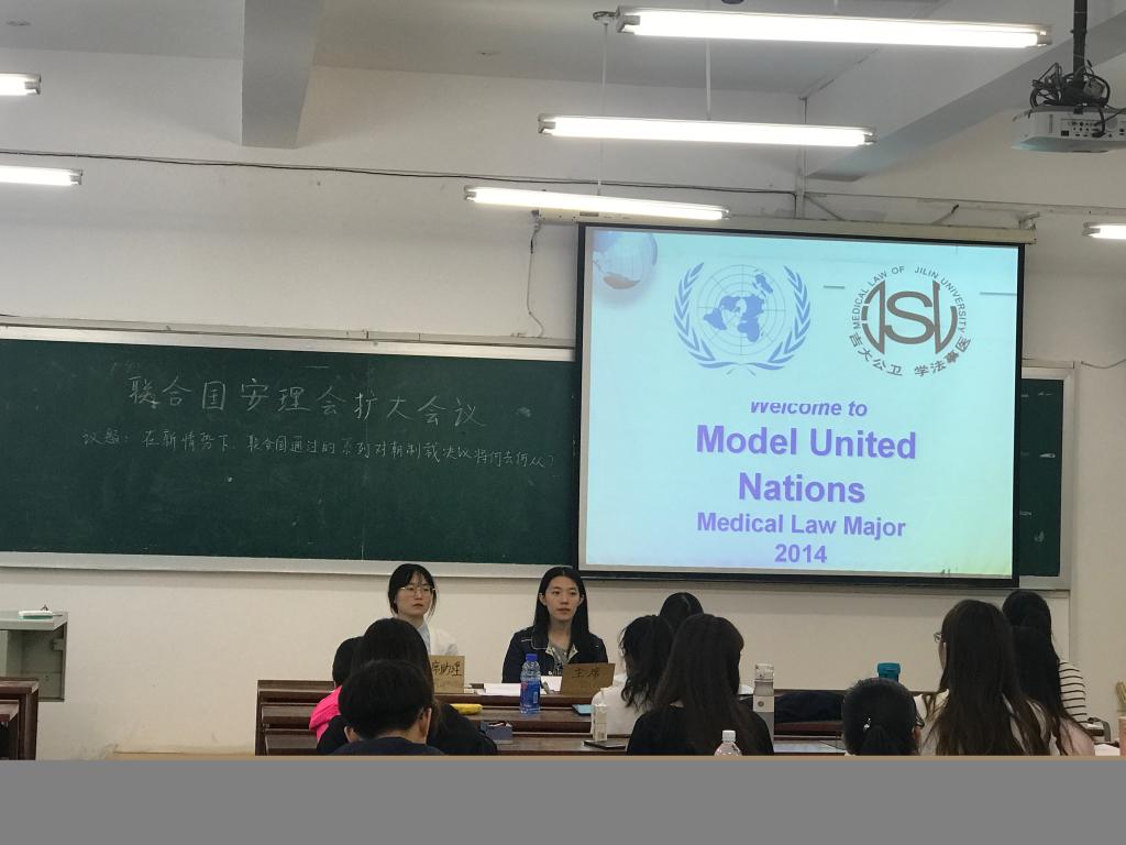 模联代表队也多次获得国内外比赛佳绩。鉴于此,2018年5月22日,2014级医事法学专业的同学们在国际法课堂上开展了一场别开生面的的模拟联合国安理会扩大会议,议题为“在新情势下,联合国通过的系列对朝制裁决议何去何从”。大会在主席徐一铭同学的主持下有序开展。在正式辩论环节,由各位同学以联合国成员国国家代表的身份提出立场文件并在大会上发言,而且韩国代表和中国代表两次提出的动议得到通过,各国代表就其展开有主题讨论。