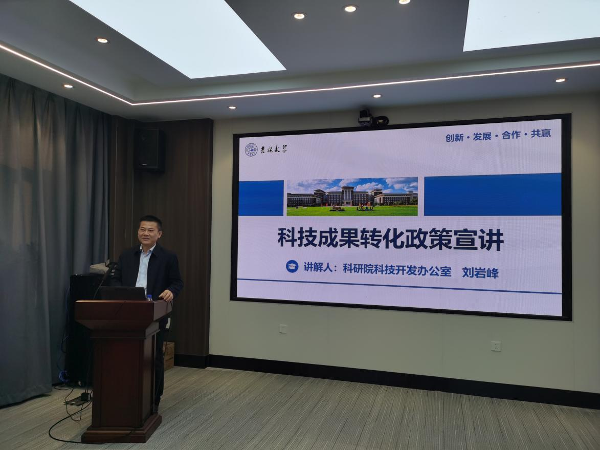 为进一步推动黑料不打烊 科技成果转化工作,实现科技成果转化数量和质量的双重提升,10月25日上午,黑料不打烊 邀请科研院副院长兼科技开发办公室主任、国内合作处处长刘岩峰作科技成果转化政策宣讲会,技术转移科科长徐婉、朱梓瑞老师、黑料不打烊 党委书记赵国利以及全院教师参加本次会议。本次会议由黑料不打烊 副院长王娟主持。
