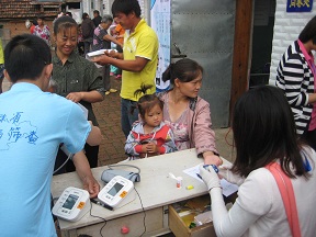 农民慢性病筛查健康体检走进双阳区鹿乡镇卫生院,在乡卫生院医生的协助下,我们挂起了健康宣传条幅,也很快便将各设备安置妥当,随即就来了大批参加免费体检调查的本地居民。面对着“浩浩荡荡”的人群,志愿者的倦意顿时全失,队员们都各尽其责,积极投入到工作中去,问卷和各项体检工作也都有条不紊地进行着。然而,对于我们问卷中一些关于人民衣、食、住、行等方面的问题,很多居民表现出的是不理解、不配合甚至是抵触心理,他们认为这些都与健康体检无关而且时间过长,但志愿者用微笑、耐心和真诚向他们详细解说了这一问卷调查对健康体检结果的重要意义。果然,有付出就有回报,有努力就有收获,人们纷纷由开始的不愿意合作填写问卷,到后来都愿意敞开心扉、说出心里话并配合我们工作了。这让志愿者很是欣慰,在一定程度上提高了志愿者的积极性、让我们激情倍增。