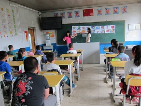 英语课上,两个志愿者拿出打印好的水果图片开始了讲课,并在讲课的过程中穿插个各种小趣闻或者记忆单词的窍门,使得学生们觉得英语是一件十分有趣的事情。志愿者互相配合,教得认真详细,学生们踊跃参与,学得兴趣盎然。一节课的时间很快过了大半。后半节课志愿者们拿出准备好的水果、沙拉酱,和学生们一起做水果沙拉。由于大部分孩子从来没有见过水果沙拉,所以表现出极大的好奇,争先恐后地帮着切水果挤沙拉,场面极其热闹。