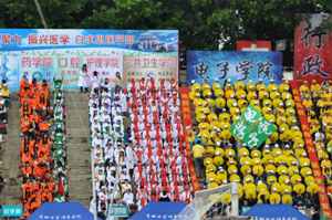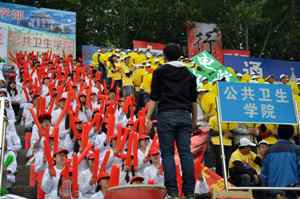 学生会生活部部长及部员带领下高喊“争冠夺魁,唯我公卫,青春无畏,舍我其谁”的口号。尽管不是每个人都能参加比赛,获得冠军,但是大家都把自己的热情融入到运动会中。蒙蒙的细雨挡不住大家的热情,我们都在为运动会奉献自己的力量。
