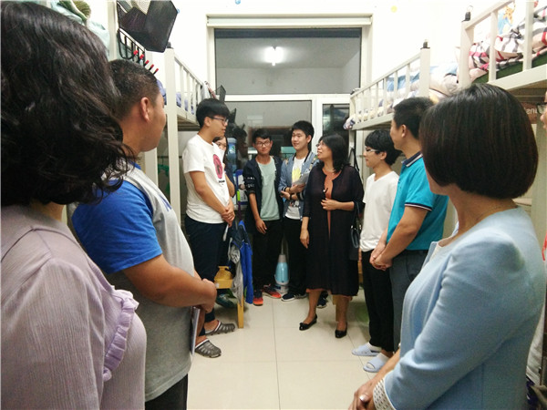 院长李娟、党委书记赵国利、党委副书记兼副院长、2014级辅导员刘丽,学生工作办公室主任兼2013级辅导员吴晓辉,团委书记兼2015级辅导员苏国范,2016级辅导员霍睿,在2017级辅导员郭倩君、新生辅导员助理及部分学生干部的陪同下走访了学生寝室。