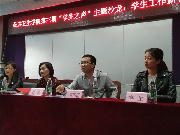 党委副书记兼副院长、2014级辅导员刘丽,团委书记兼2015级辅导员苏国范,2016级辅导员霍睿,2017级辅导员郭倩君,以及各年级学生代表参加了本次沙龙活动。本期活动以“学生工作新畅想”为主题,学生代表们针对学生事务处理和学生工作要求提出了具体的建议,参与活动的老师也细心地答复问题、第一时间了解了学生们的想法。