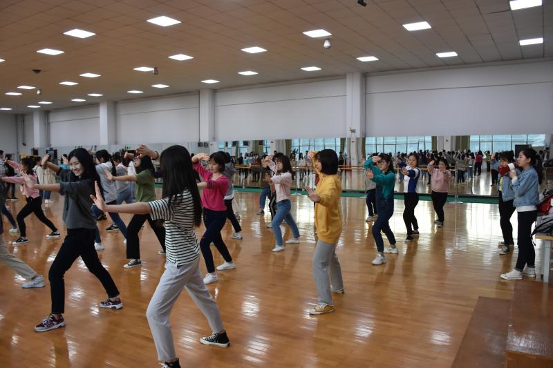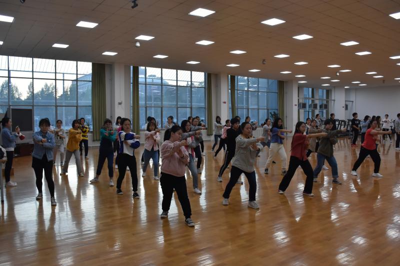 新民校区体育馆健美操室组织2017级32名同学进行太极拳集训。