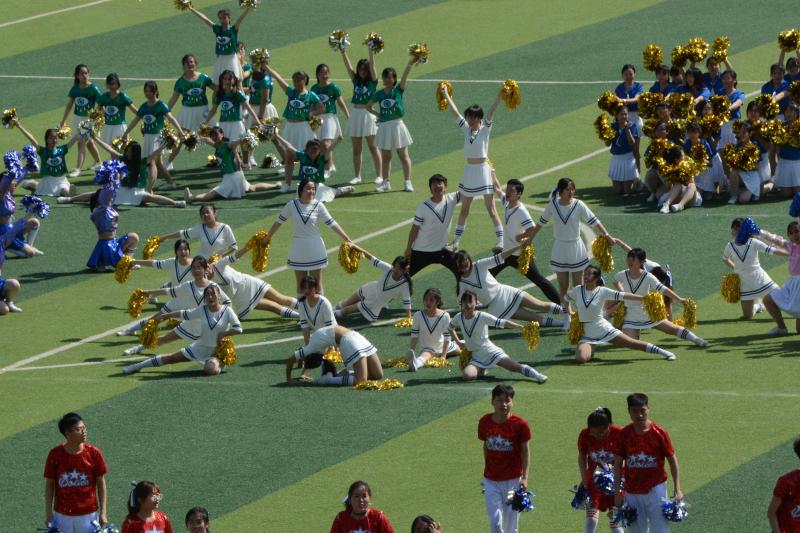 广播体操、啦啦操表演队伍上场,她们舞动花球,迎风奔跑,形成了一条七彩波浪。