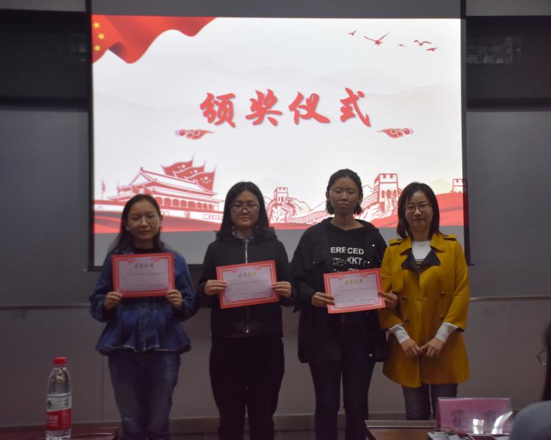 片刻之后,十名晋级选手的名单公布了。接下来,晋级的选手们需要随机抽取朗读文章,并在五分钟之内做好上台准备。紧张的准备时间过后,选手们依次上台朗诵,用诗词告白祖国,用声音致敬祖国。准备时间的短暂并没能影响他们饱含感情得朗诵,他们完美的表演赢得了观众们热烈的掌声。同样是在愉快的游戏环节后,主持人上台宣布了获奖选手的名单,并由霍睿老师、冷贺璇老师、曲景辉同学为获奖选手进行了颁奖。活动最后,参加活动的全体成员起立宣誓并合影留念。
