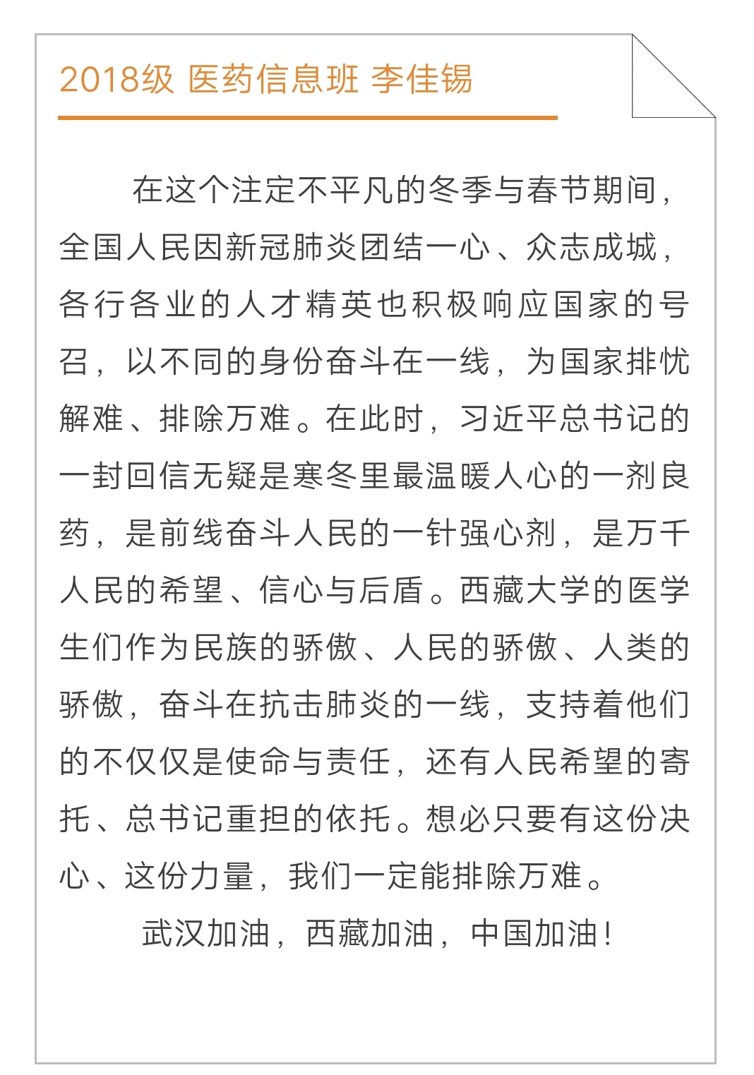 在这个特殊的时期,本次活动的开展让同学们认识到学习近平总书记回信精神,不仅要学深悟透,更要及时行动,实践所学知识,造福社会。在这场疫情防控阻击战中,无数的医务工作者用他们的行为为全体医学生做出了表率,树立起精神的丰碑。作为一名医学生,传承白求恩精神,牢记责任使命,学好专业知识,坚定崇高思想,这是公卫学子从疫情中学到的最真切的体悟。