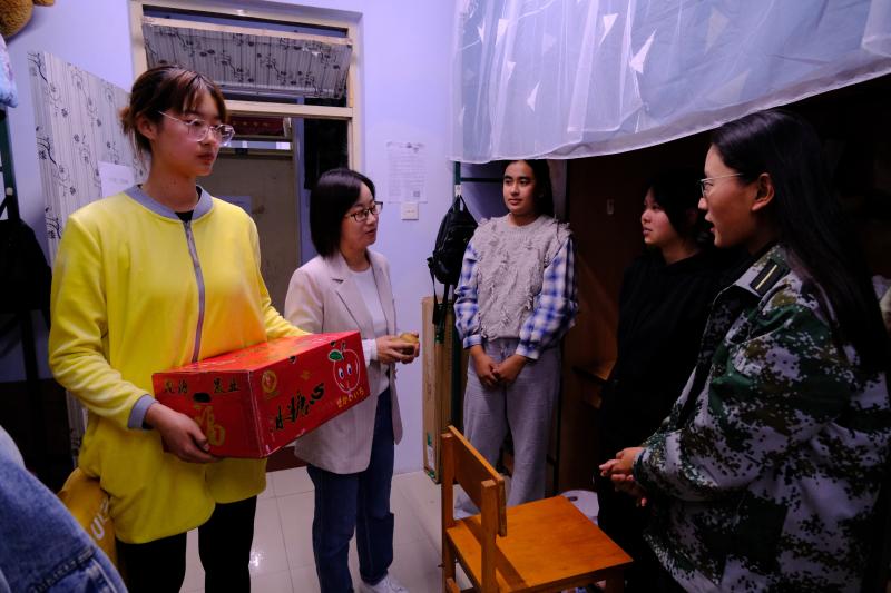 9月30日晚,冷贺璇老师与导助们带着礼物来到新生寝室,逐一走访,为新生送上精心准备的月饼和苹果,以及中秋的祝福。月饼代表喜迎中秋,苹果寓意着平安顺遂。冷老师祝大家中秋节快乐,希望大家都能在未来的日子里平平安安。收到礼物和祝福的新生们纷纷对感谢老师表达了自己的感谢之情,并同样祝福老师中秋节快乐。接着,冷老师和新生们谈论各自家乡的情况,还聊起了同学们在初入大学这段时间里的点点滴滴,说到有趣的地方,大家都笑出了声。一时间整个宿舍洋溢着节日的欢乐。最后,老师叮嘱大家近日气温多变,要注意防寒保暖。同时严格遵守疫情防控要求,中秋假期期间不要随意外出,有问题或者需要帮助的时候可以随时与老师联系。这个中秋节虽然没有家人的陪伴,但是有黑料不打烊