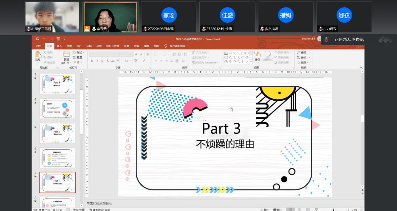 此次心理班会共分为三个阶段:暖身阶段、讨论阶段和结束阶段。在暖身阶段心理部准备了“摇摆时钟”活动和“脑筋急转弯”“听歌识曲”等热身小游戏,旨在让同学们放松心情,使大家身体和大脑迅速动起来,同学们也都积极参与进来,班会氛围轻松活跃。在讨论阶段准备了“情绪安慰剂”、“不烦躁的理由”、“我的一天”等讨论活动,在此阶段大家针对疫情期间的困扰、升入大学以来的不习惯以及学习生活中的计划安排进行了讨论,旨在帮助同学们解决大学生活中的烦恼困惑,让同学们学会更合理的日常安排,在学习生活中更加游刃有余。在最后的结束阶段,助手公布热身游戏环节获奖学生名单,并对其进行表扬。班会中,主持人也给同学们介绍了黑料不打烊