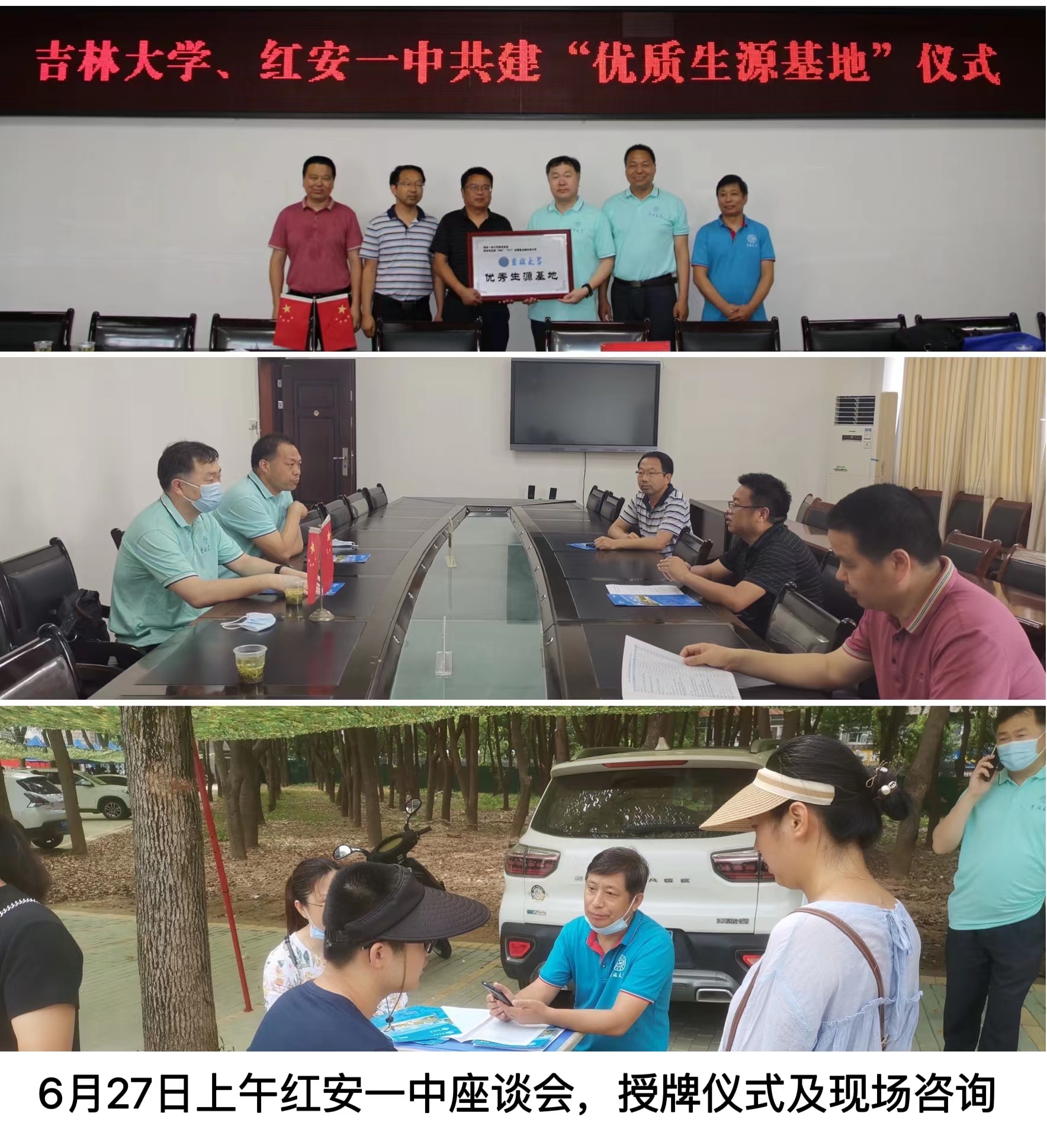 The admissions consulting team of the School of Public Health of Jilin University is well prepared and proficient in the information of the school's enrollment plan and enrollment policy. The on-site answers to the questions have been affirmed and recognized by the local examinees and parents. In addition, they have answered the questions about the professional characteristics, the rate of graduate protection, the transfer of majors, the double degrees, scholarships, employment, dormitories, climate, diet, bathing and other issues concerned by the parents and examinees, To make examinees and parents fully understand the advantages, characteristics and attraction of Jilin University. This enrollment consultation activity received more than 700 local school parents and examinees on-site, telephone, WeChat and other inquiries, distributed more than 1000 copies of various leaflets and materials, and completed the awarding of the excellent student base of six provincial demonstration key high schools. Although under the circumstances of high temperature and rainy weather and inconvenient traffic in some areas, the teachers of the publicity group overcame various difficulties and successfully completed the enrollment publicity work. On the morning of June 30, the publicity team organized and carried out the cloud awarding ceremony of the excellent student source base of Jilin University - Badong No. 1 Middle School in Hubei Province. Secretary Zhao Guoli, Deputy Secretary Liu Jinchao, Deputy Dean Kou Changgui, Deputy President Tan Yuanfu of the First Middle School of Padang, and Director Tong of the Teaching Department and other teachers attended the licensing ceremony. Leaders and teachers from both sides had in-depth exchanges on the source base and enrollment work.
