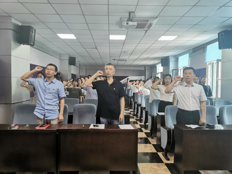 最后,由赵国利书记为新老党员讲了一场题为学好党的历史,奋进新时代党课指出入党宣誓仪式是加入党组织的重要环节,也是对新老党员一次深刻的党性教育,让老党员回顾初心,让新党员看到希望。同时对大家提出三点希望:1、要不忘初心,牢记使命,时刻牢记为人民服务的宗旨,为人民谋幸福,为国家谋复兴2、要在学习工作中发挥党员的先锋模范作用,时刻以党员标准要求自己,维护党员的形象3、要坚定理想信念,努力践行自己的入党誓词,不断以更高的标准要求自己,追求进步。赵国书记以习总书记在建党百年讲话中的两段为结尾:未来属于青年,希望寄予青年。新时代的中国青年要以实现中华民族伟大复兴为己任,增强做中国人的志气、骨气、底气,不时代,不负韶华,不负党和人民的殷切期望!二是习近平总书记向全党发出号召:全体中国共产党党员,党中央号召你们,牢记初心使命,坚定理想信念,践行党的宗旨,永远保持同人民群众的血肉联系,始终同人民想在一起,干在一起,风雨同舟,同甘共苦,继续是为实现人民对美好生活的向往不懈努力努力,努力为党和人民争取更大的光荣