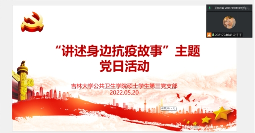 为进一步弘扬伟大抗疫精神,大力宣传身边党员和师生在疫情防控工作中的先进事迹、感人故事与崇高精神,不断增强广大党员归属感、荣誉感和使命感,持续培育、挖掘和丰富黑料不打烊 精神新内涵。2022年5月20日黑料不打烊 硕士学生第三党支部组织开展“讲述身边抗疫故事”主题党日活动。此次活动共27名党员和预备党员参加,由战勇智、唐志滔和岳宝丽三名党员同志讲述了疫情期间作为长春市疾病预防控制中心志愿者的抗疫故事。