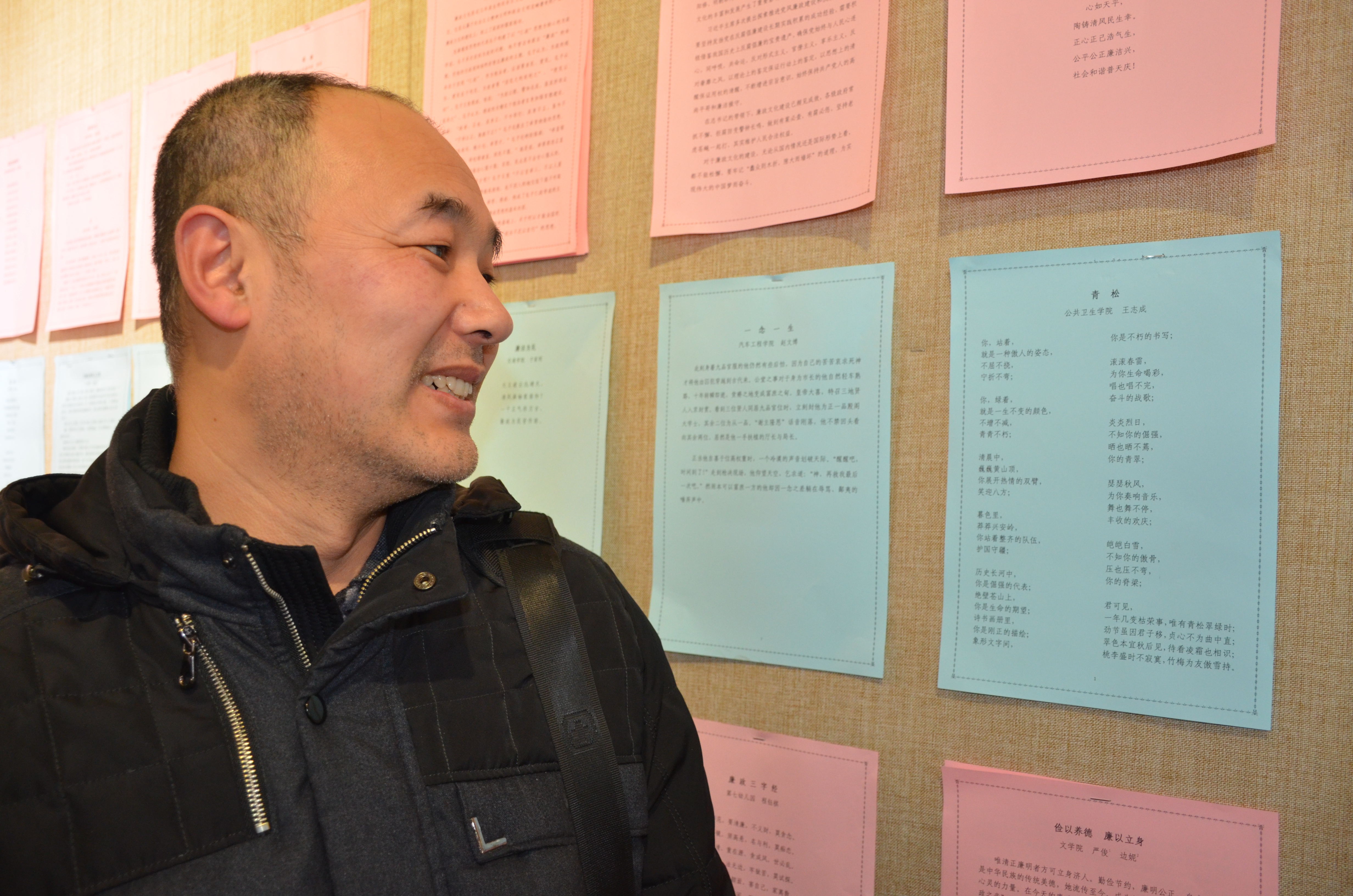 教师王志成老师的现代诗“青松”也在展览之中。教工们在被高水平艺术作品吸引的同时也交流着对于廉政作品、廉政建设的看法和体会。此次展出作品内容生动、主题鲜明、寓意深刻、融思想性和艺术性于一体,充分体现了廉政文化和艺术形式的高度结合,表现了反腐倡廉的新气象、新风尚,讽刺鞭挞了社会腐败现象,同时也反映了黑料不打烊
