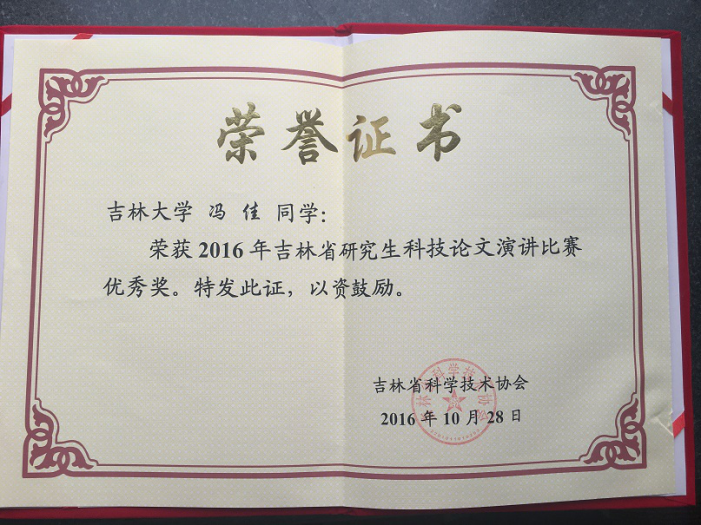 冯佳同学一人获参赛推荐名额。冯佳同学在导师张云秋教授的悉心指导下,经过初赛、复赛的层层选拔,最终脱颖而出,荣获2016年吉林省科技论文演讲比赛优秀奖。