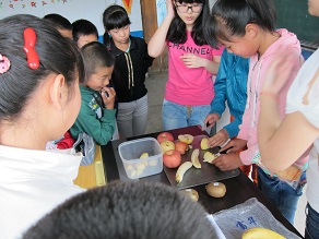 英语课上,两个志愿者拿出打印好的水果图片开始了讲课,并在讲课的过程中穿插个各种小趣闻或者记忆单词的窍门,使得学生们觉得英语是一件十分有趣的事情。志愿者互相配合,教得认真详细,学生们踊跃参与,学得兴趣盎然。一节课的时间很快过了大半。后半节课志愿者们拿出准备好的水果、沙拉酱,和学生们一起做水果沙拉。由于大部分孩子从来没有见过水果沙拉,所以表现出极大的好奇,争先恐后地帮着切水果挤沙拉,场面极其热闹。