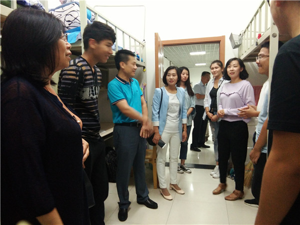院长李娟、党委书记赵国利、党委副书记兼副院长、2014级辅导员刘丽,学生工作办公室主任兼2013级辅导员吴晓辉,团委书记兼2015级辅导员苏国范,2016级辅导员霍睿,在2017级辅导员郭倩君、新生辅导员助理及部分学生干部的陪同下走访了学生寝室。