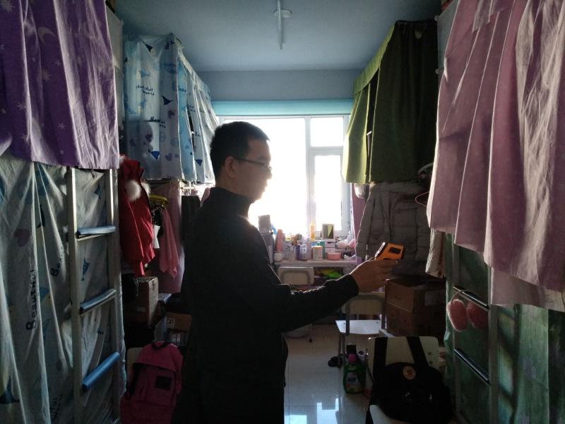 苏老师详细测量,记录寝室中各个位置的温度,对室内温度不达标的寝室,苏老师仔细检查了寝室环境,对可能影响室内温度的问题进行一一排查,检查窗户是否关严,窗户是否存在缝隙,暖气片上是否有杂物遮盖等。对于存在问题的寝室,苏老师都详细记下,在查寝结束后,联系请后勤人员尽快修缮,争取为学生营造最暖心的居住环境。同时,苏老师还叮嘱同学们天气寒冷 ,应当多加衣物,注意保暖,并仔细询问了同学们在学习和生活上的困难、问题,尽心尽力为学生解忧。