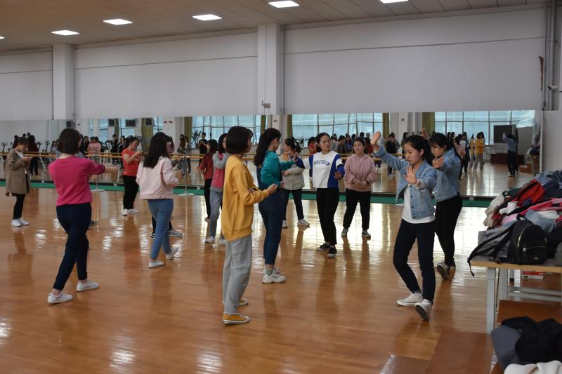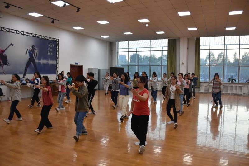 新民校区体育馆健美操室组织2017级32名同学进行太极拳集训。