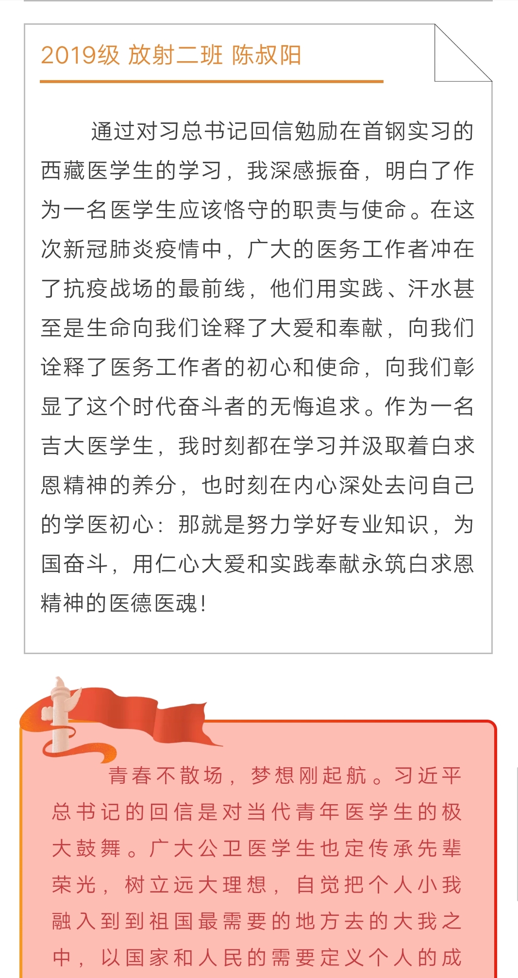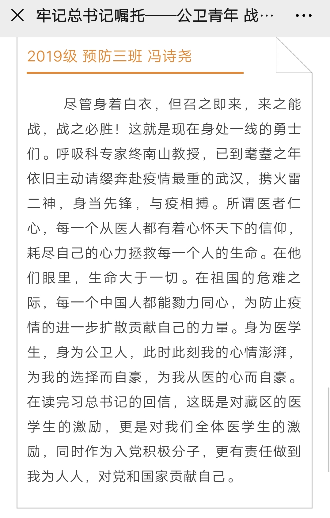 在这个特殊的时期,本次活动的开展让同学们认识到学习近平总书记回信精神,不仅要学深悟透,更要及时行动,实践所学知识,造福社会。在这场疫情防控阻击战中,无数的医务工作者用他们的行为为全体医学生做出了表率,树立起精神的丰碑。作为一名医学生,传承白求恩精神,牢记责任使命,学好专业知识,坚定崇高思想,这是公卫学子从疫情中学到的最真切的体悟。