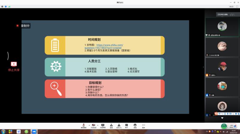 团学组织学生会创新就业指导部在7月15日于腾讯会议平台举办了大创经验分享会。分享会邀请了来自2017级有丰富大创项目经验的四位同学进行经验分享与问答交流,多位2018级、2019级学生参与。