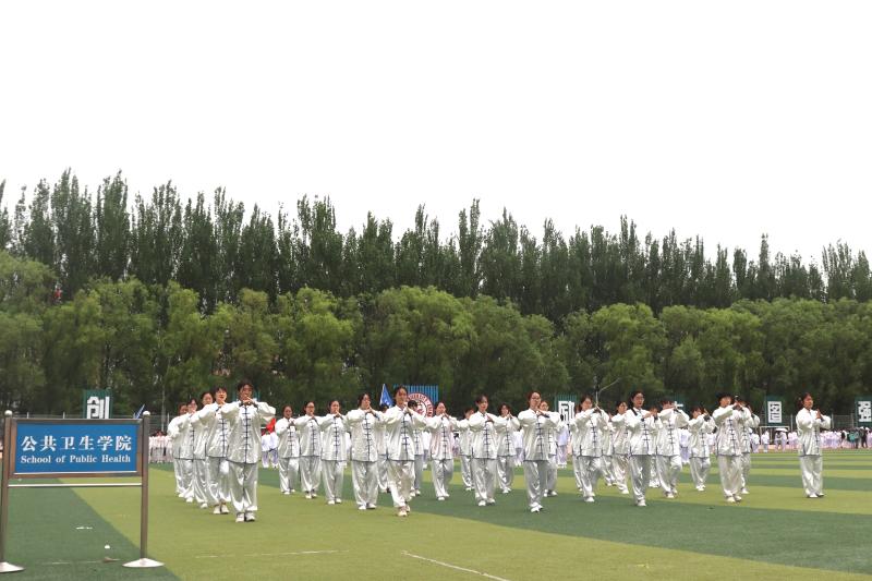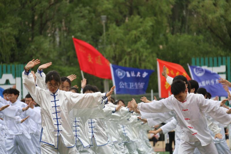 为一组同时上场表演,公共卫生学院太极代表队于第五组上场表演。表演过程中同学们的每一次抬手,每一次出拳,每一次转身,都体现出他们平日训练里的严谨,认真和辛苦。每一个眼神,每一个表情,每一个动作无不展现着公卫学子的青春活力。赛后同学们还表达了对将要举行的运动会的期待以及对运动员们的勉励。